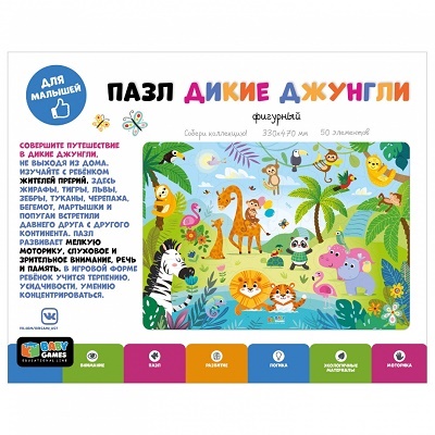 Пазл "Дикие джунгли" познакомит Вашего ребёнка с обитателями джунглей, их флорой и фауной, поможет развитию мелкой моторики и усидчивости. Пазл из 50 элементов с такими интересными героями станет любимой игрой любого малыша.