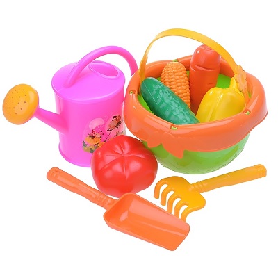 Набор для песка включает в себя все необходимые инструменты для работы в огороде, корзину и муляжи овощей: огурца, помидора, моркови, кукурузы, сладкого перца.
