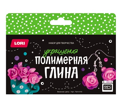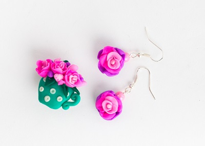 Полимерная глина — материал для лепки, застывание которого происходит только под воздействием высоких температур. С помощью набора можно создать красивую брошь и серьги в едином стиле.