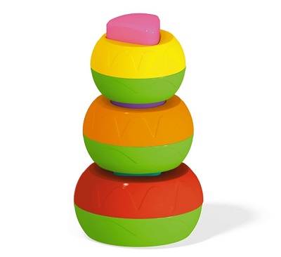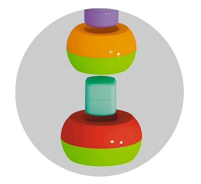 Наша пирамидка интересна тем, что роль стержня в ней выполняют разноцветные геометрические фигурки. В кольцах игрушки есть углубления, каждое из которых имеет определенную форму. Задача крохи подобрать подходящие друг к другу колечко и фигурку, соединить между собой и построить «фонтанчик».