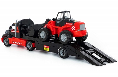 Шикарный подарочный набор, который состоит из большого автомобиля и большого трактора. Автомобиль-трейлер предназначен для перевозки различных автомобилей и техники длиной не более 43 см. Для удобства погрузки на трейлере установлен откидной трап. Полуприцеп при необходимости легко отцепить. Трактор-погрузчик, как и автомобиль, выполнен из надёжного долговечного материала, привлекает дизайном. Трактором можно играть в песочнице, на игровых площадках и дома. Набор выполнен в узнаваемых цветах компании МАММОЕТ, известной своей специализацией на тяжёлых подъёмных работах и транспортировке тяжёлых грузов по воде и по суше.