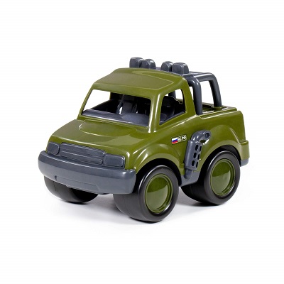 Джип оборудован крутящимися колёсами, поэтому его легко катать даже самым маленьким детям. Военная машинка изготовлена из прочного пластика, окрашена в тёмно зелёный цвет, как настоящая военная техника. Игрушку можно брать с собой на улицу в песочницу, а после прогулок просто помыть под проточной водой и играть дома.