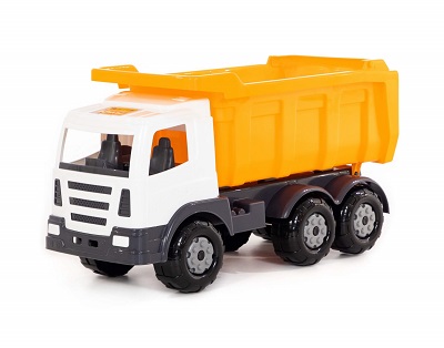 Большой самосвал на трех металлических осях с открывающимся задним бортом для разгрузки. В кузов ребенок сложить все свои песочные принадлежности или детали конструктора, машинки и другие игрушки. В кабину в качестве водителей малыш посадит свои фигурки. Каждый мальчишка желает иметь у себя в автопарке большой самосвал.