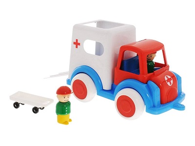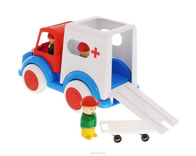 Если в игрушечном городке случиться беда и одному из кукольных жителей вдруг понадобиться помощь – на выручку отправится специализированный автомобиль скорой помощи! Игрушка имеет плавные формы и яркие цвета. На корпусе нанесён символ медицины – красный крест. Заднюю дверь автомобиля можно откинуть и использовать её в качестве пандуса, для того, чтобы можно было по нему вкатить больного на каталке. Дети смогут реализовать различные игровые задумки, используя фигурки отважных работников медицинской службы.