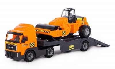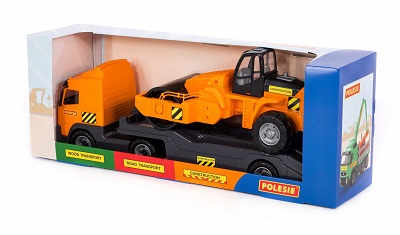 Шикарный подарочный набор, содержащий и большой автомобиль, и дорожный каток. Автомобиль-трейлер предназначен для перевозки различных автомобилей и техники, длиной не более 43 см. Для удобства погрузки на трейлере установлен откидной трап. При необходимости полуприцеп легко можно отцепить. Каток, как и автомобиль, выполнен из надёжного долговечного и красивого материала. С ним можно играть в песочнице, на игровых площадках и дома. Набор из автомобиля и катка вызывает восторг у маленьких любителей транспорта.