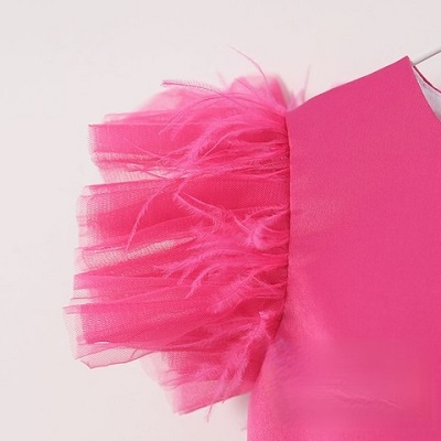 - на плечах пышные оборки из многослойной сеточки и легких перышек