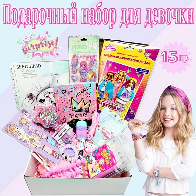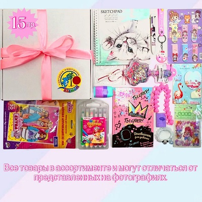 Подарочный набор "Сюрприз бокс" для девочки - это идеальный подарок для дочки, внучки, подруги на день рождения, 8 марта, 1 сентября, а так же на любой праздник. Сюрприз бокс - это комплект разных подарков для досуга вашего ребенка. В данном комплекте содержится 15 интересных и увлекательных предметов, начиная от Скейчпада и заканчивая антистрессом тянучкой. Подарочный набор содержит предметы с разной тематикой и цветовой гаммой. В комплект входит: Скейчпад, набор фломастеров, аппликация, ластик-точилка 3 в 1, расческа, дневничок для девочек, набор закладок, наклейки, комплект блоков с липким слоем, брелок, браслет, тянучка антистресс, ластик, аксессуар для волос, ручка 6 цветов. Все предметы в сюрприз боксе в ассортименте и могут отличаться от фотографии, но всегда заменяются аналогичными. Подарочный набор будет интересен для любого ребенка, так как это не просто подарок, а настоящий сюрприз. Ваш ребенок будет доставать каждый предмет, не догадываясь, что дальше попадется.