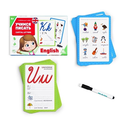 В этой коробочке вас ждут карточки, которые помогут изучить прописные буквы английского алфавита и научиться их писать. А так как карточки ламинированные, стереть написанное можно легко обратной стороной маркера.