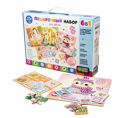 Подарочный набор 6в1, выполненный в дизайне серии Baby Games, создан специально для девочек! Внутри мы собрали красочные пазлы и развивающие настольные игры: лото, домино, мемори и аппликацию 22х22см с мягкими самоклеящимися деталями. Просто наклеивай слой за слоем. Получившаяся яркая 3D-картинка украсит ваш дом. Игры тренируют моторику, память, логику и внимательность ребенка. Коробка набора не требует дополнительной упаковки, а богатое наполнение подарит море радости!