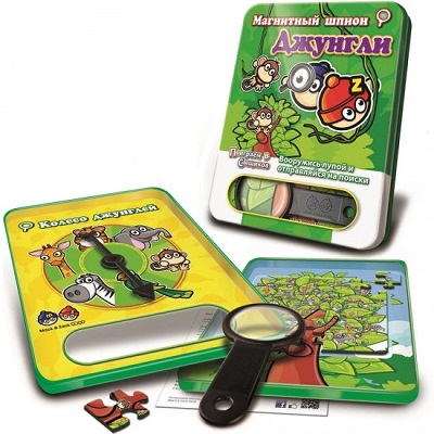 Магнитная игра "Джунгли" - удачный выбор для тех родителей, которые не хотят, чтобы дети скучали в дороге. В комплект входит магнитный пазл. Соберите его на металлической коробке, и вы получите поле для увлекательной игры в следопытов. Взяв в руки увеличительное стекло, маленькие сыщики отправится на поиски спрятавшихся в кустах жителей джунглей. Им придется на скорость найти тех животных, на которых укажет стрелка волчка.