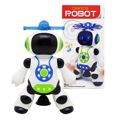 Танцующий робот игрушка со световыми и звуковыми эффектами весело танцует, кружится, двигает руками и ногами, вращает пропеллером и выпускает яркие, led лучи. Диско эффект игрушечного танцора создается питанием от 3 батареек АА (приобретаются отдельно). Игрушечный, детский робот танцор особенно красив с приглушенным светом. На стенах и потолке создается проекция светового представления. В руки и пропеллер встроены разноцветные лампочки.