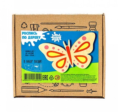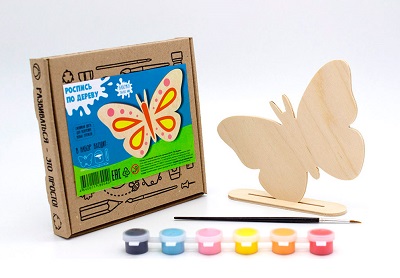 Набор для росписи по дереву. В набор входят: деревянная фигурка Бабочка, 1 подставка, густые акриловые краски - 6 цветов по 4мл, кисть.