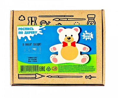 Набор для росписи по дереву. В набор входят: деревянная фигурка Мишка, 1 подставка, густые акриловые краски по 4мл, кисть.