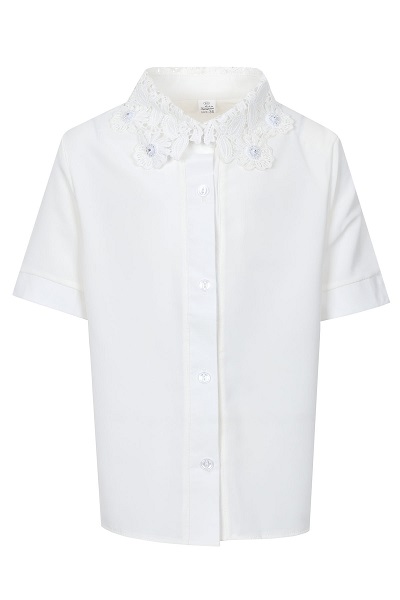 Лёгкая однотонная рубашка на девочку с короткими рукавами выполнена из полиэстера. Прямой крой обеспечивает комфортную посадку. Изделие с манжетами на пуговицах и отложным ажурным воротником. Застёгивается спереди на пуговицы. Не сковывает движения. Лёгкая ткань. Размер 34-42.