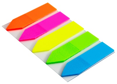 Пластиковые закладки с клеевым краем предназначены для временных пометок страниц. На закладках можно делать надписи. Закладки изготовлены из цветной полупрозрачной полимерной плёнки, которая не закрывает текст страницы. Специальный клеевой состав позволяет надёжно крепить и многократно переклеивать закладки, не оставляя следов и не повреждая поверхность.